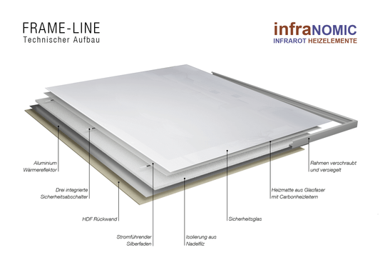 Unsere Glasheizelemente mit unterschiedlichsten Rahmenausführungen verfügen über das volle Leistungsspektrum der Infranomic Produktpalette und bestechen durch ihr zeitloses Design bei einem gleichzeitig sehr attraktiven Preis. Standardmäßig mit einer weißen oder schwarzen Sicherheitsglasfront und einem silbernen, 10 mm breiten Aluminiumrahmen ausgestattet, fügen sie sich elegant in jedes Wohnumfeld ein. Die darüber hinausgehenden Variationsmöglichkeiten bei der optischen Ausführung sind nahezu grenzenlos. Ob als Spiegel, einfarbig in fast jeder beliebigen RAL Farbe oder mit Motivdruck bis hin zu eigenen Wunschmotiven ist alles möglich. Wählen Sie zudem aus zahlreichen verschiedenen Rahmenvarianten.